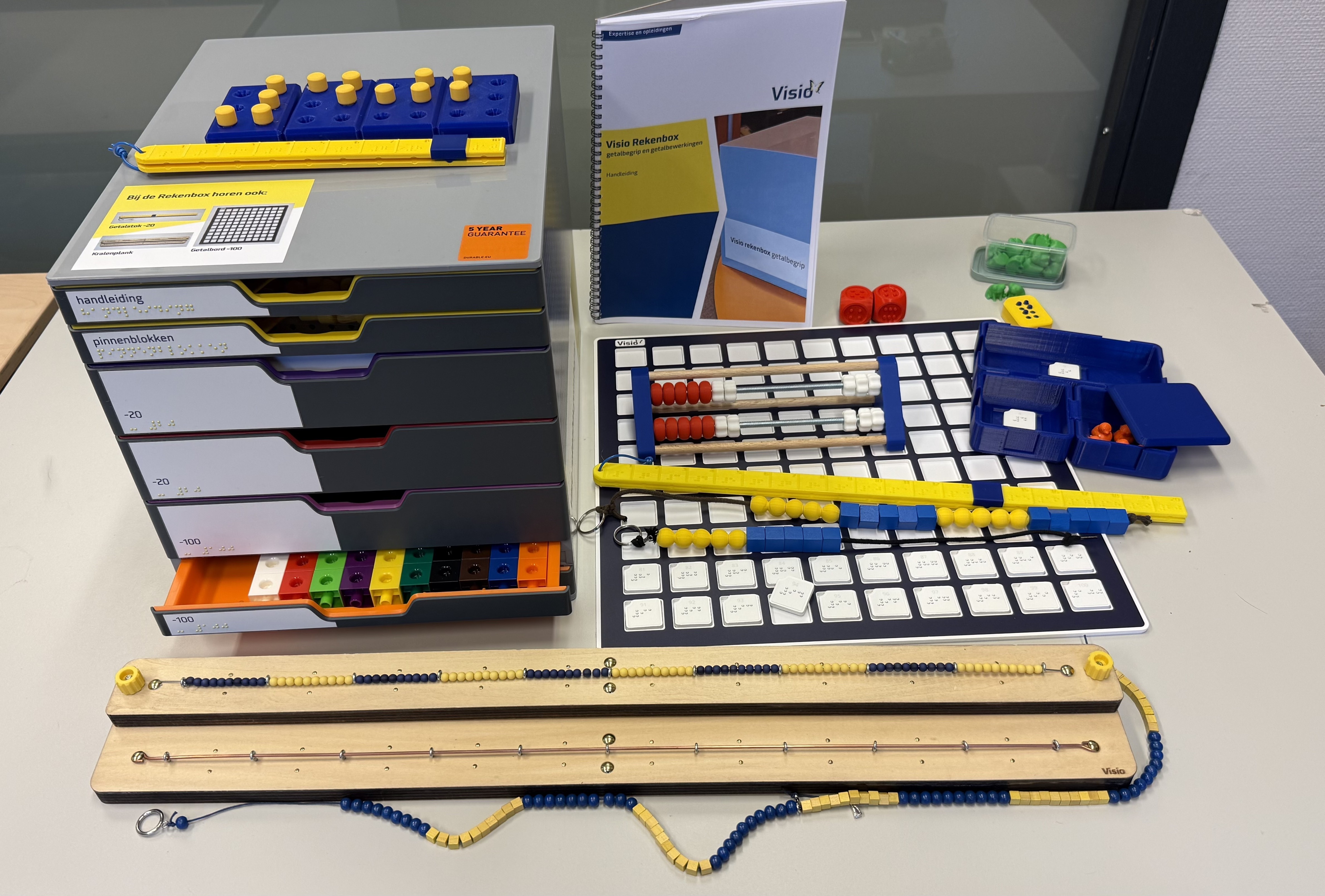 De nieuwe Rekenbox stimuleert het handelend rekenen en bouwt voort op de rekenkoffer die Visio in 2008 ontwikkelde. Het pakket bevat 3D-geprinte tastbare materialen, waaronder kralensnoeren, een rekenrekje en een grote kralenplank met een voelbare, gestructureerde lege getallenlijn in de logische 5- en 10-structuur.